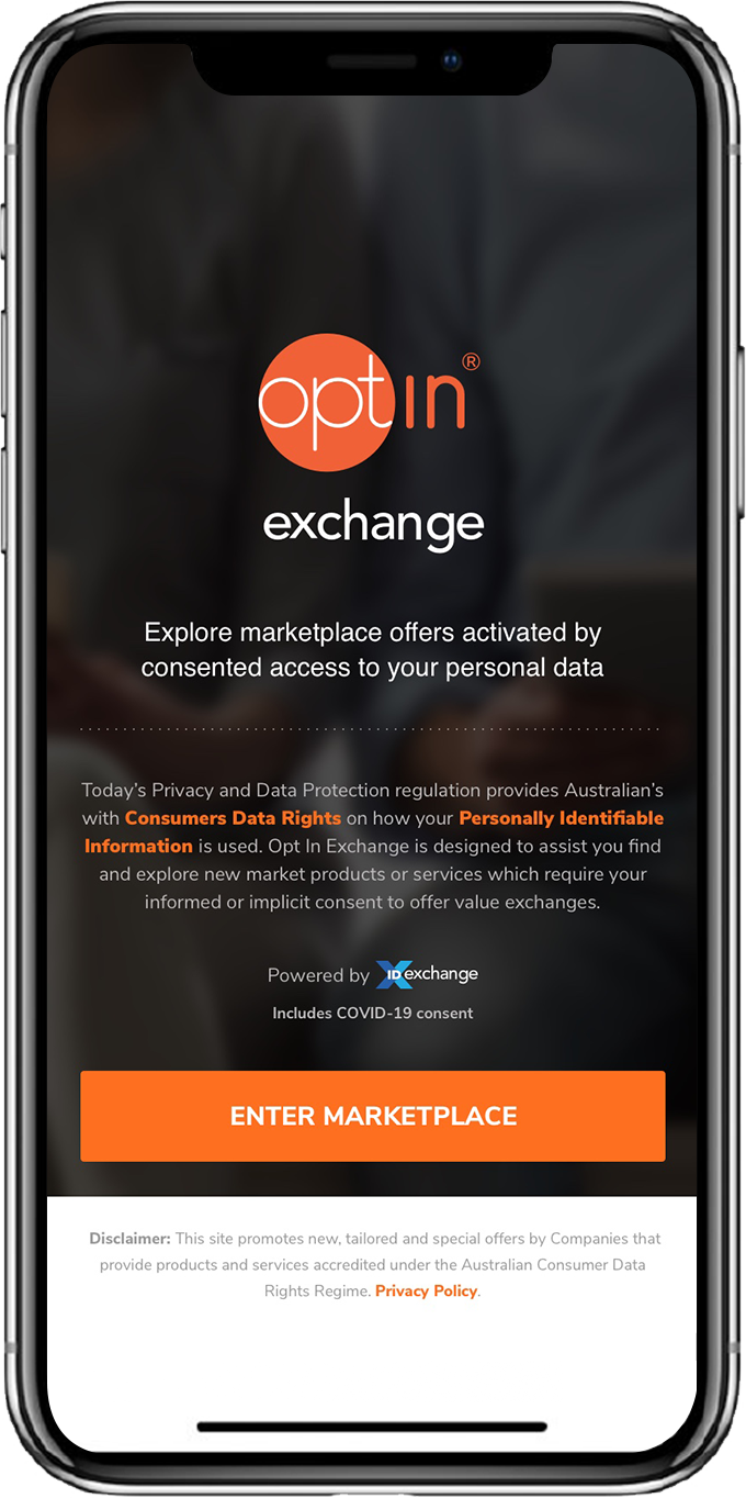 Consumer offers promoted on the future Opt In Exchange marketplace will only be activated when an individual has successfully signed into the ecosystem and asserts an authorised and verified expressed Opt In consent instruction to the service promoting a specific value exchange. Businesses offering value exchanges on the Opt In Exchange must comply with the app’s strict terms of use which assures the promoter has met local regulatory, data sharing and privacy legislation mandates.